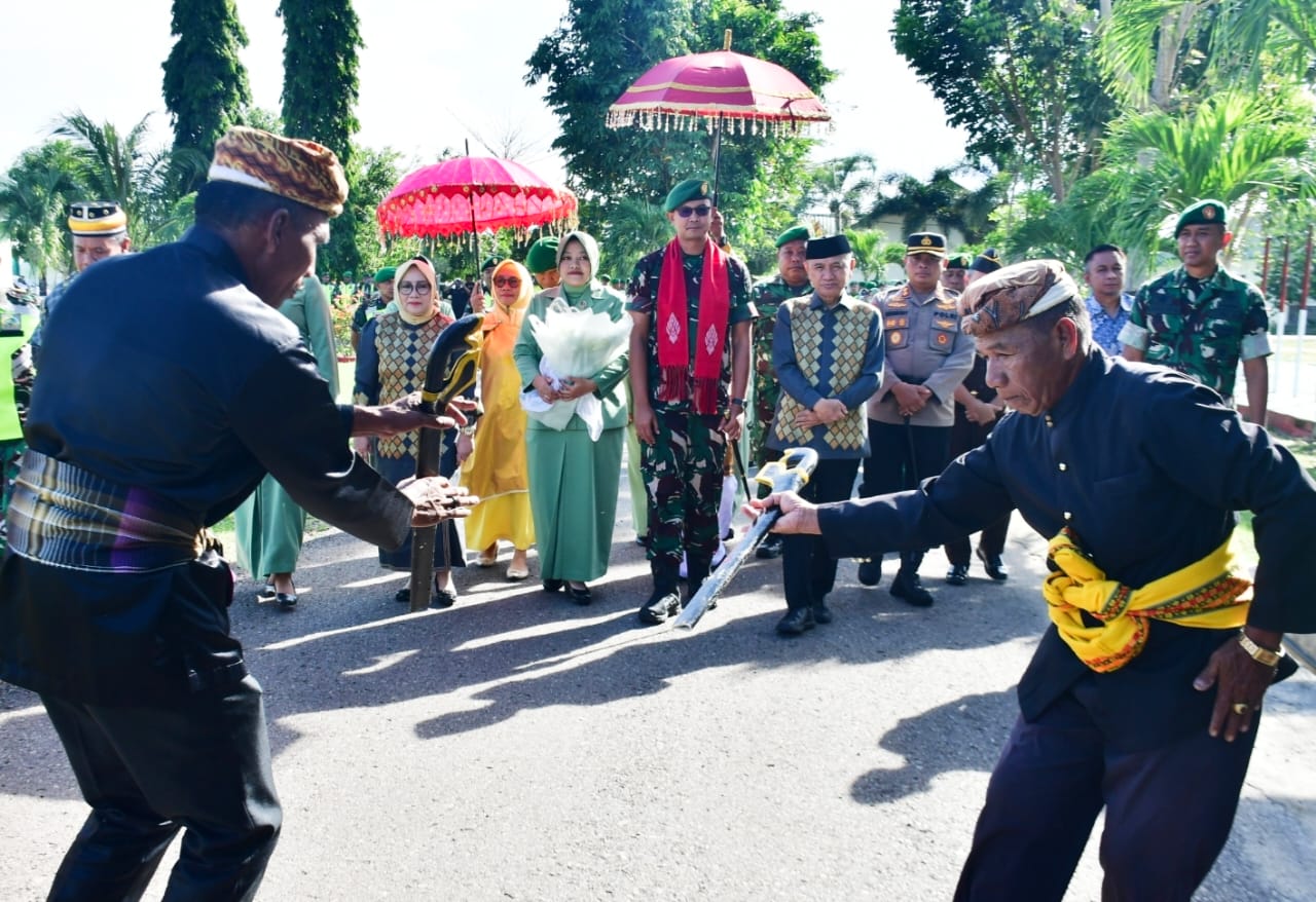 SKEMALANGIT.COM – Komandan Kodim (Dandim) 1313/Pohuwato, Letkol Arm Fiat Suwandana, S. Sos., berasama Ketua Persit Kartika Chandra Kirana, Ny. Frinda Fiat Suwandana, disambut dengan prosesi adat mopotilolo, di Makodim 1313/Pohuwato, Kamis (11/12/2025).