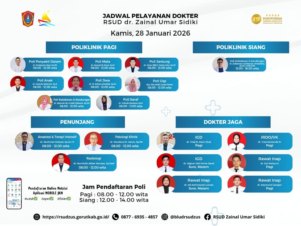 Khusus layanan poliklinik , pasien akan dilayani oleh para dokter terbaik RSUD ZUS Kabupaten Gorut, mulai pukul 08.00 Wita sampai dengan pukul 12.00 Wita, Kamis 28 Januari 2026.Di